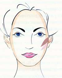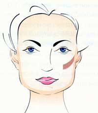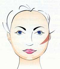 Ромбовидное лицо - широкое в области скул и узкое в верхней и нижней частях. При данном типе целью коррекции является смягчение угловатых очертаний лица. Дополнительным цветом затемняется боковая поверхность скул, а основные румяна наносятся в форме двух лепестков: более темного цвета - на выступающую часть скулы и светлые - на подскуловую впадину с целью ее смягчения. Таким образом, впадина под скулой становится менее заметной. Если вы хотите, наоборот, подчеркнуть скулы, то на них нанесите основные румяна, а под скулы - более темный цвет.