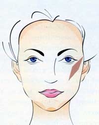 Треугольное лицо характеризуется ярко выраженным острым подбородком. Цель коррекции - уравновесить верхнюю (широкую) часть лица с более узкой нижней. Для этого следует затемнить дополнительными румянами височную область лба и лобные бугры, а затем и острый подбородок, высветлив при этом линии нижней челюсти. Основные румяна наносятся чуть выше скул на выступающую часть в форме ромба.